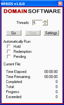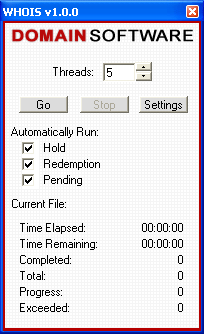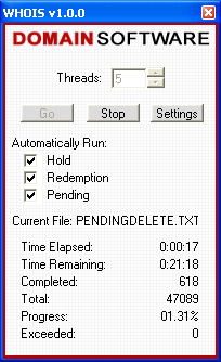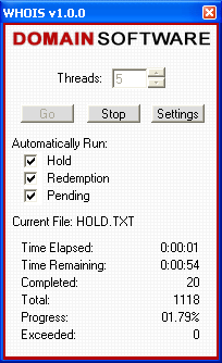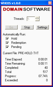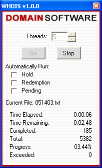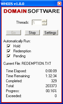 | Contents: I. Introduction II. Usage III. Help I. Introduction: WHOIS Analyzer was developed by Domain Software, LLC., to scan and compile domain name lists of pre-hold, hold, on hold (REDEMPTIONPERIOD) domain names, soon to expire (PENDINGDELETE) domain names and expired domain names. II. Usage:  To begin using WHOIS Analyzer you will need to select what list(s) you wish to scan.  In this case, we will be scanning a single domain name list, thus we do not need to Automatically Run a domain name list. After your lists are selected, you have the option to choose how many threads you want open. In general, the more threads open, the more connections you have open and thus the quicker scanning lists takes. However, it is not recommended to have a large number of threads open for prolonged periods of time as it can cause strain on your system. Our recommendation is 5 threads as it has shown to work best on most high speed internet lines.  After all domain name lists are checked and the amount of threads open is set, you will then click the Go button. Next, a file box will appear asking for you to select which domain name file you want to scan. All files scanned must be .TXT files and there must be a line break between each domain name. Once the file is selected and opened, WHOIS Analyzer will rename the file to *filename*.txt.bak (*filename* is the actual file's name, WHOIS Analyzer only adds '.bak' to the end of the file).  After the domain name list is selected, WHOIS Analyzer will automatically begin scanning the domains against the WHOIS servers. Time Elapsed displays the how long the file has been scanned for. Time Remaining estimates the time that remains until scanning the file is complete. Times are calculated on the total number of submissions since WHOIS Analyzer started with the current domain name list. Completed refers to the amount of domain names that have been submitted to the WHOIS servers thus far. Total refers to the total amount of domain names that are in the current domain name list. Progress calculates and divides the Completed domains by the Total amount of domain names. Exceeded refers to any domain name that was rejected or denied by the WHOIS servers; in this case it will be added to the end of the domain name file and will be scanned again until a successful response is received from the WHOIS servers.  If you want to scan all domain name lists supported by WHOIS Analyzer (Pre-Hold, Hold, Redemption Period and Pending Delete) then they must be selected in that exact order. For example, here we are going to scan all 5 domain name lists automatically. To begin, we will select to Automatically Run - Hold, Redemption and Pending. After the three are checked, click the Go button and select the file PRE-HOLD.TXT (**Note** PRE-HOLD.TXT, HOLD.TXT, REDEMPTIONPERIOD.TXT AND PENDINGDELETE.TXT will be created after WHOIS Analyzer has completely completed its first domain name list; such as the one we selected at the top of this page - 051403.txt). After you select PRE-HOLD.TXT it will be renamed to PRE-HOLD.TXT.BAK and the new file will be called PRE-HOLD.TXT. The backup file (PRE-HOLD.TXT.BAK) is safe to delete.  After PRE-HOLD.TXT is completed, WHOIS Analyzer will automatically continue to HOLD.TXT. Again, the same procedures will take place; it is safe to delete HOLD.TXT.BAK after it is successfully scanned and completed.  After HOLD.TXT is completed, WHOIS Analyzer will automatically continue to REDEMPTION.TXT. The same procedures take place as PRE-HOLD.TXT and HOLD.TXT.  After REDEMPTION.TXT is completed, WHOIS Analyzer will automatically continue to PENDINGDELETE.TXT. Again, as the previous, it is safe to delete PENDINGDELETE.TXT.BAK after WHOIS Analyzer has successfully completed scanning the domain name list. It should be noted that WHOIS Analyzer supports Pre-Hold, Hold, Redemption Period, Pending Delete and Expired domain names for .COM and .NET. However, because of the new standards for .ORG domain names, as of now only Pending Delete and Expired domain names are supported. III. Help:  Above is an internal program error that WHOIS Analyzer may cause while being used. If this error occurs you will be prompted with two options: to click Yes and send the error data that was logged to Domain Software, LLC. technicians to help resolve the problem, or to click No and have no data sent. |